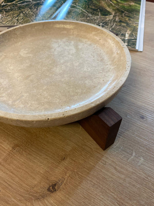 Ceviz Ahşap Ayaklı Traverten Sunum Tabağı , Ceviz Ahşap Ayaklı Traverten Mermer Sunumluk
