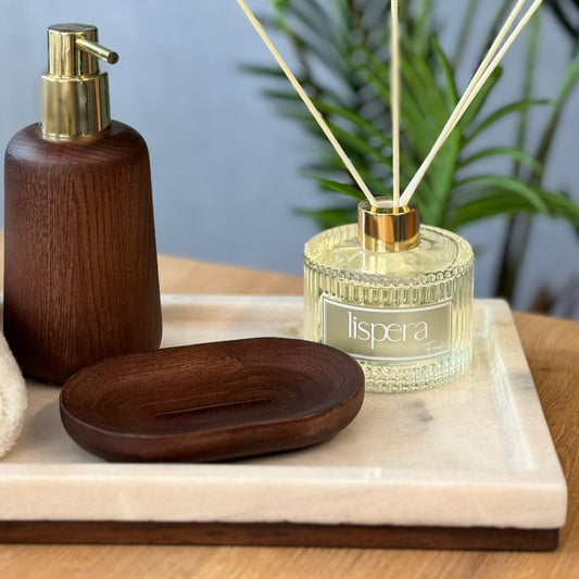 Ceviz Ahşap Tabanlı Beyaz Mermer Banyo Düzenleyici, Mermer Sunumluk ,Mermer Organizer