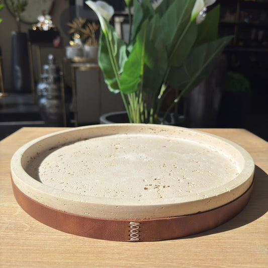 Deri Dekorlu Traverten Mermer Yuvarlak Sunumluk , Traverten Yuvarlak Sunumluk, Lüks Ev Ofis Hediyesi