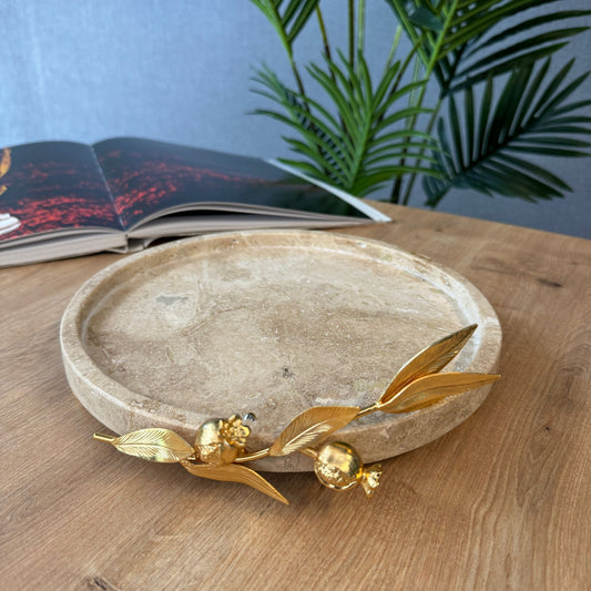 Pirinç Nar Aparatlı Traverten Dekoratif Tabak , Lüks Mermer Hediyelik ,Dekoratif Traverten Tabak ,