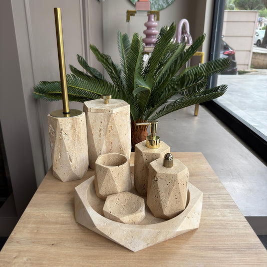 Traverten Mermer Elmas Kesim 7'li Banyo Seti