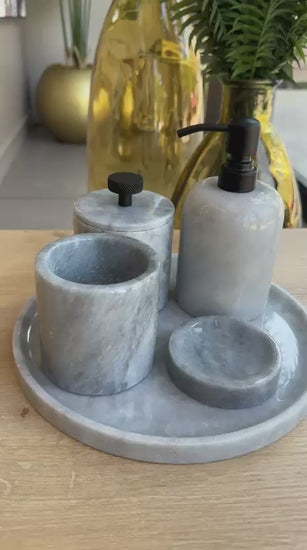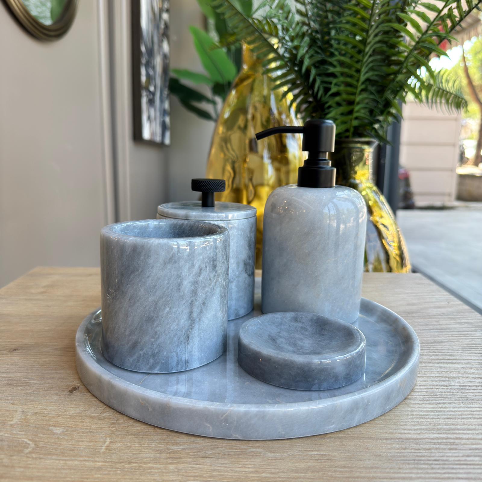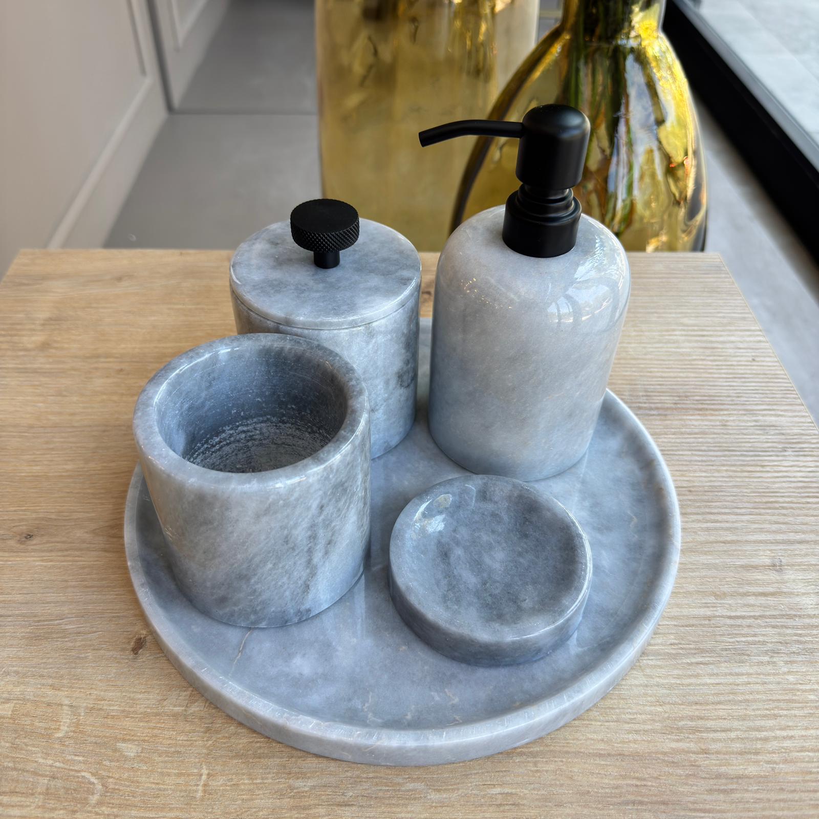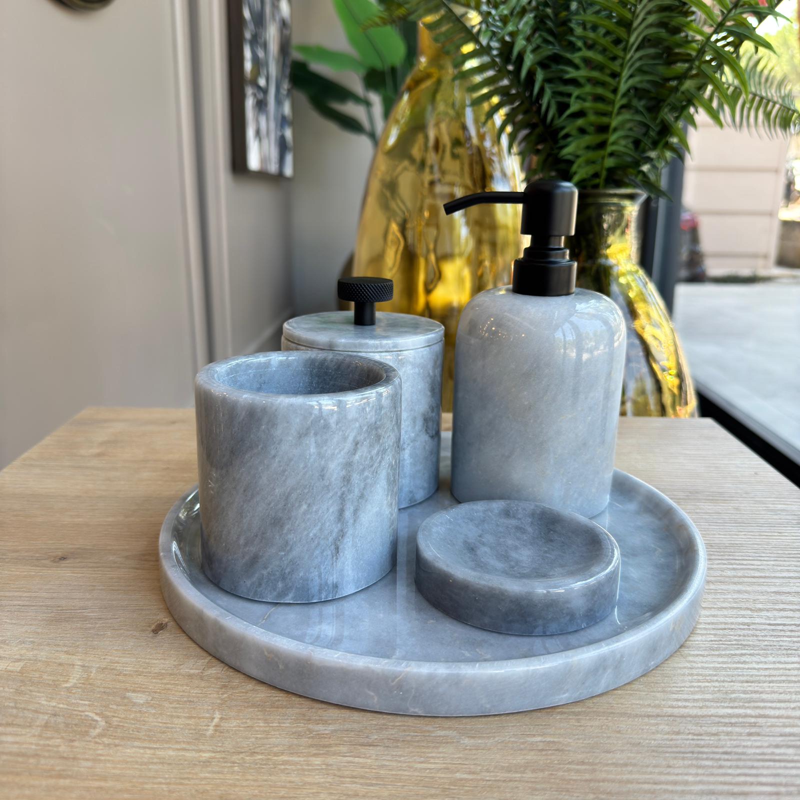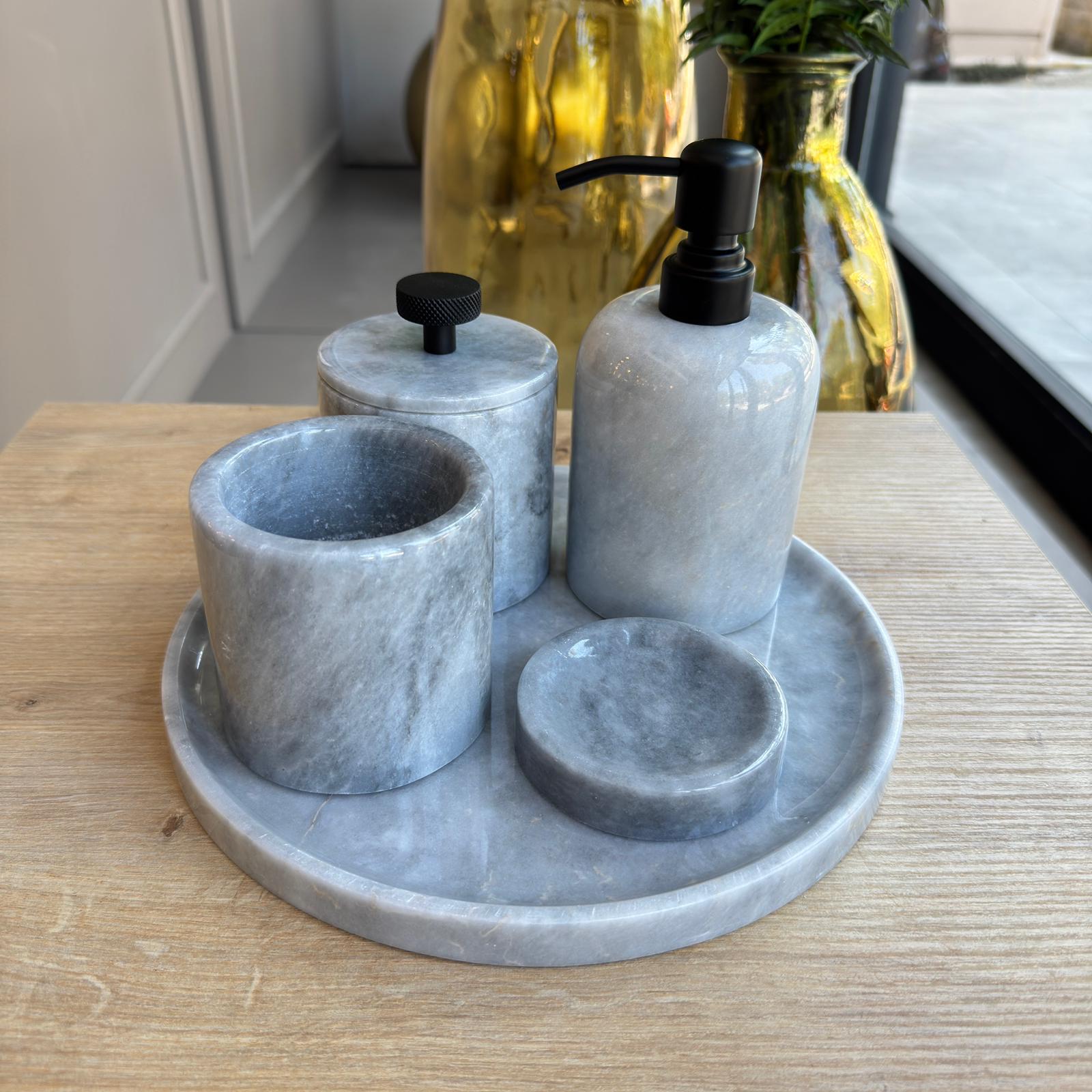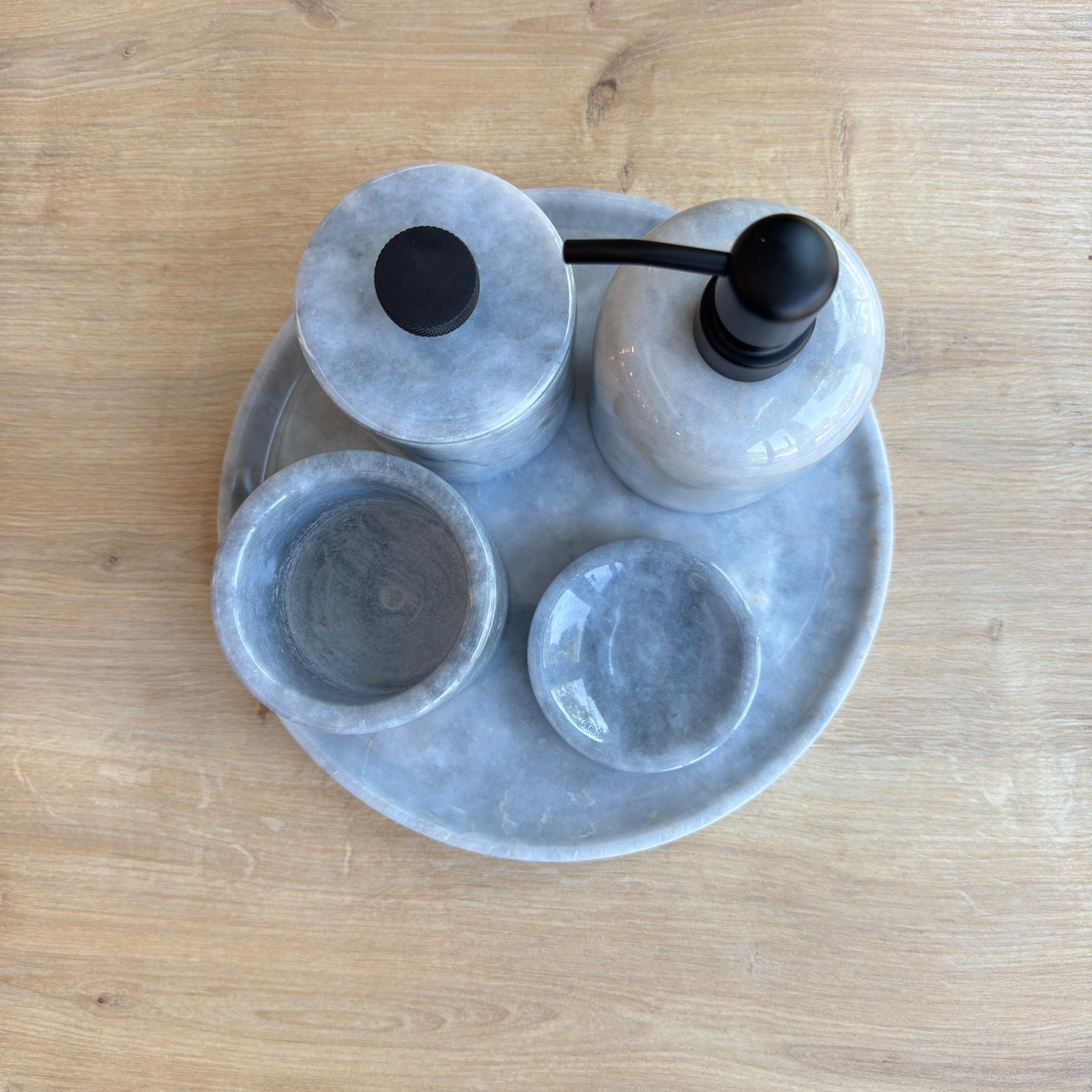 - Banyo Seti içerisinde yer alan sıvı sabunluk, pamukluk, diş fırçalık, katı sabunluk aksesuar sunum tepsisi yer almaktadır.5 parçalı mermer banyo seti, banyo dekorasyonunuza mermerin doğal dokusunu katacak .