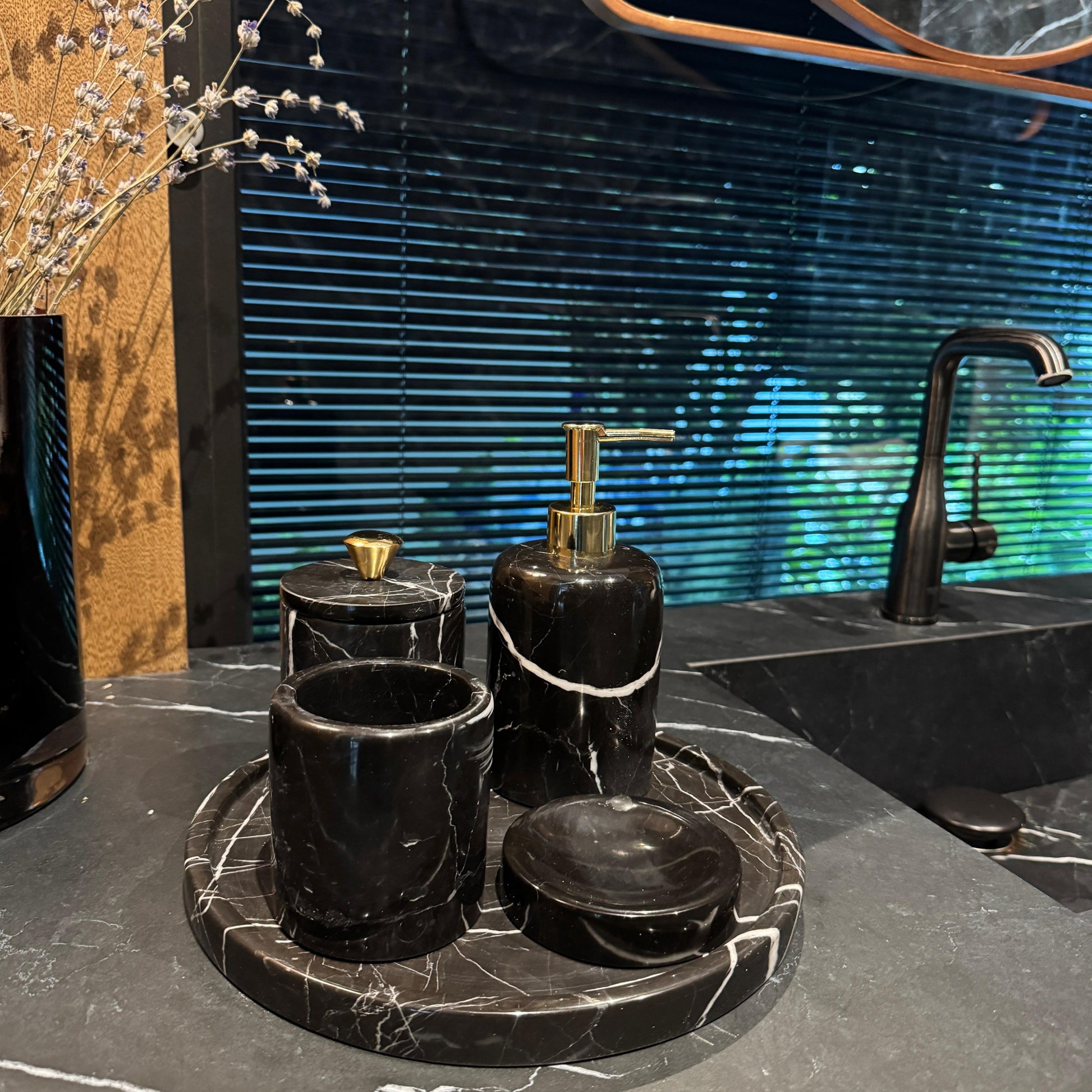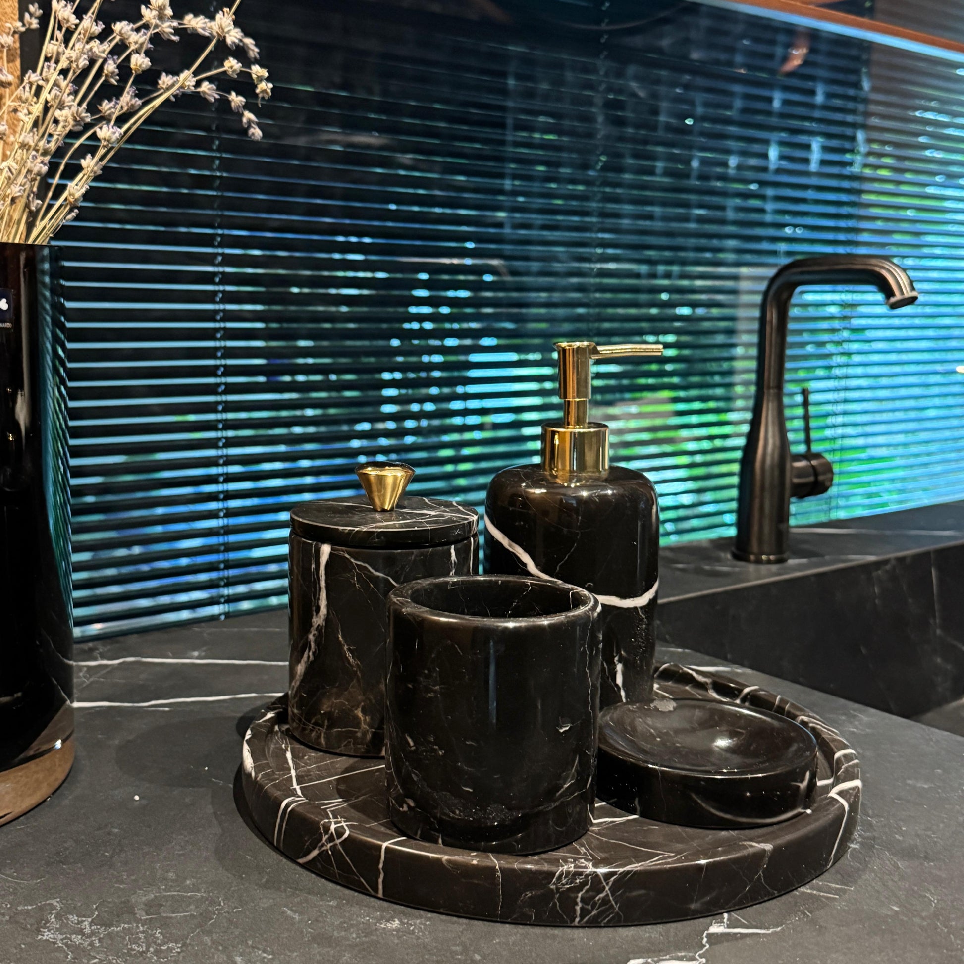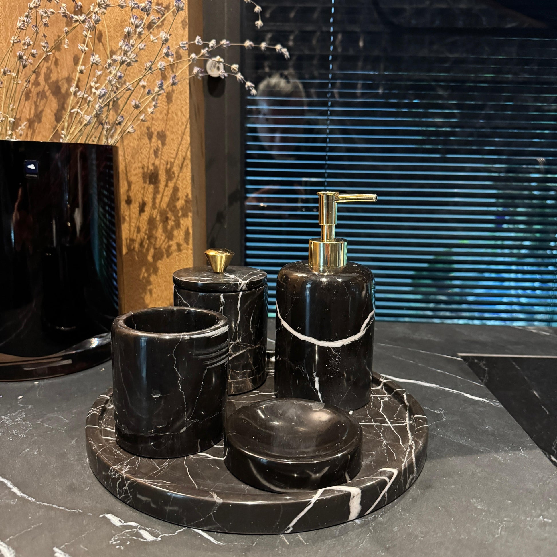 - Doğal toros siyahı mermer'den üretilmiş, banyonuza şıklık katan beş parçadan oluşan set.