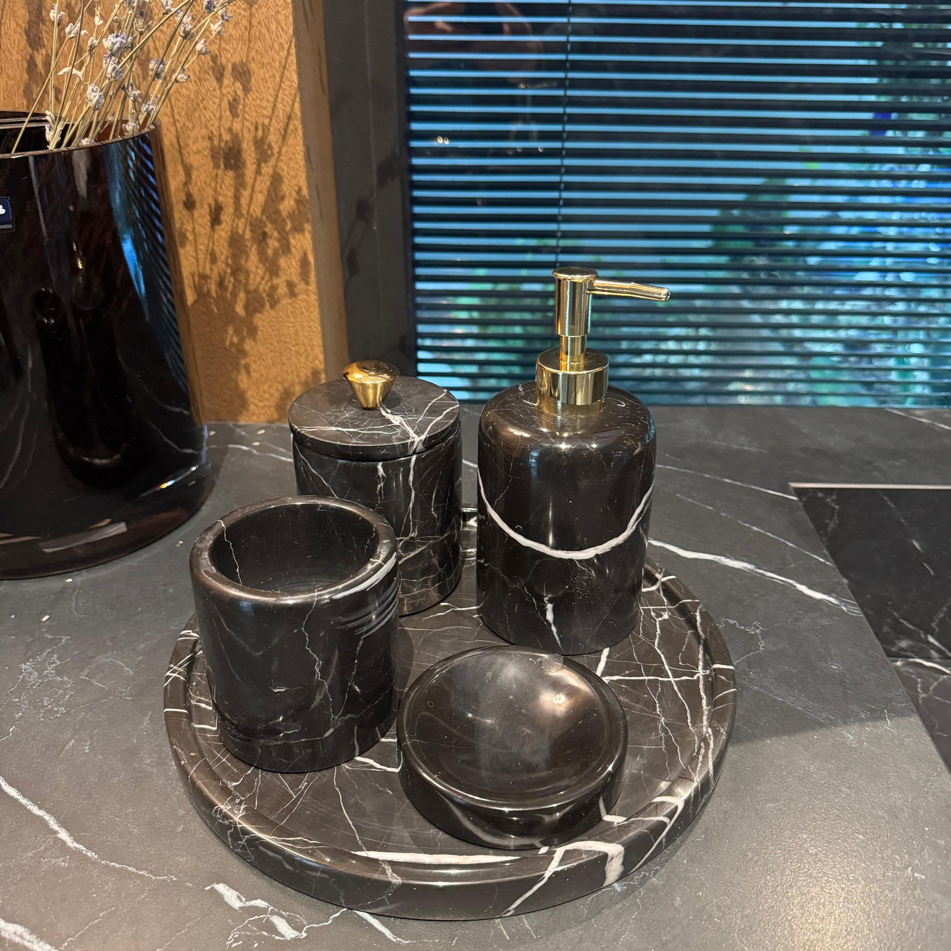 - Banyo Seti içerisinde yer alan sıvı sabunluk, pamukluk, diş fırçalık, katı sabunluk aksesuar sunum tepsisi yer almaktadır. 5 parçalı mermer banyo seti, banyo dekorasyonunuza mermerin doğal dokusunu katacak .