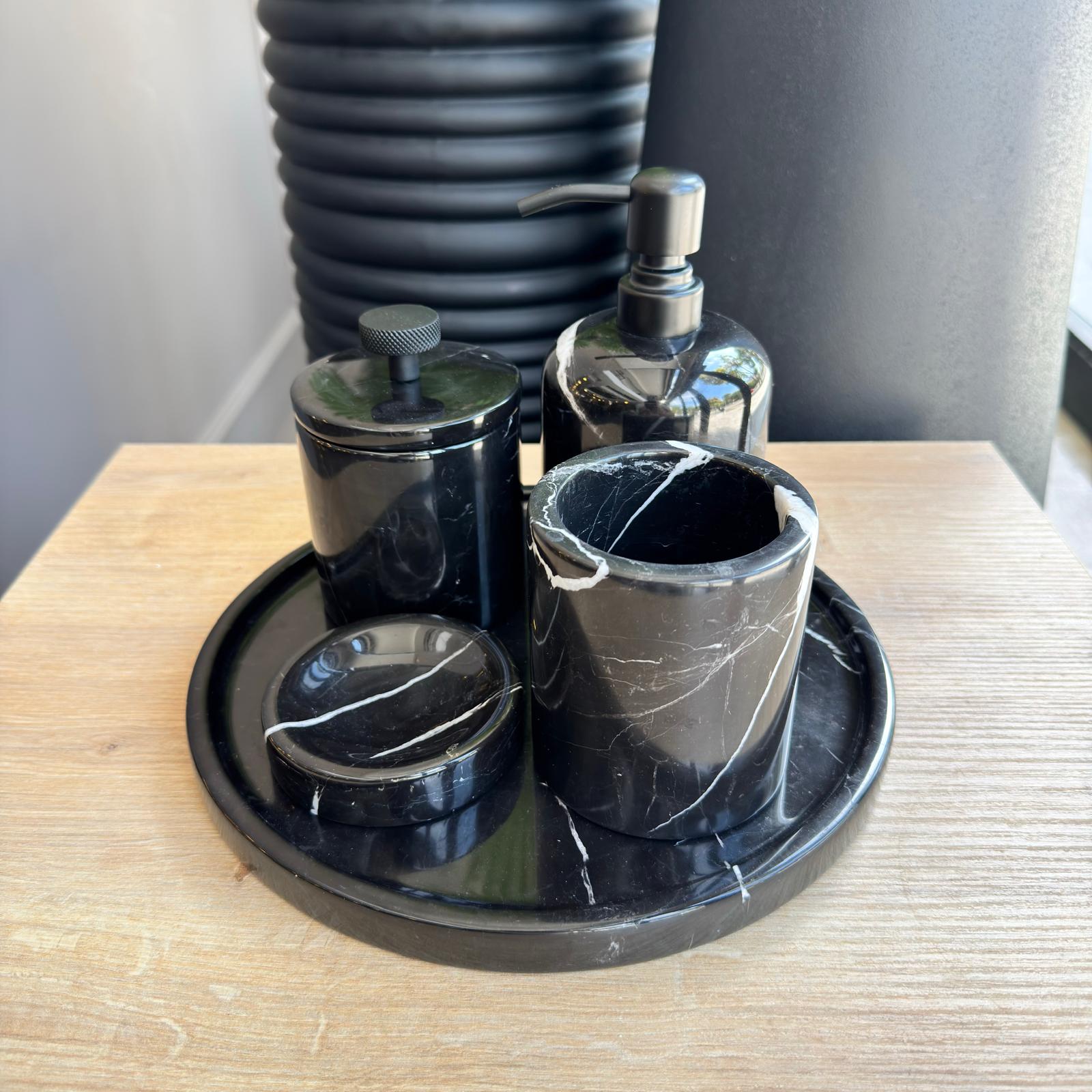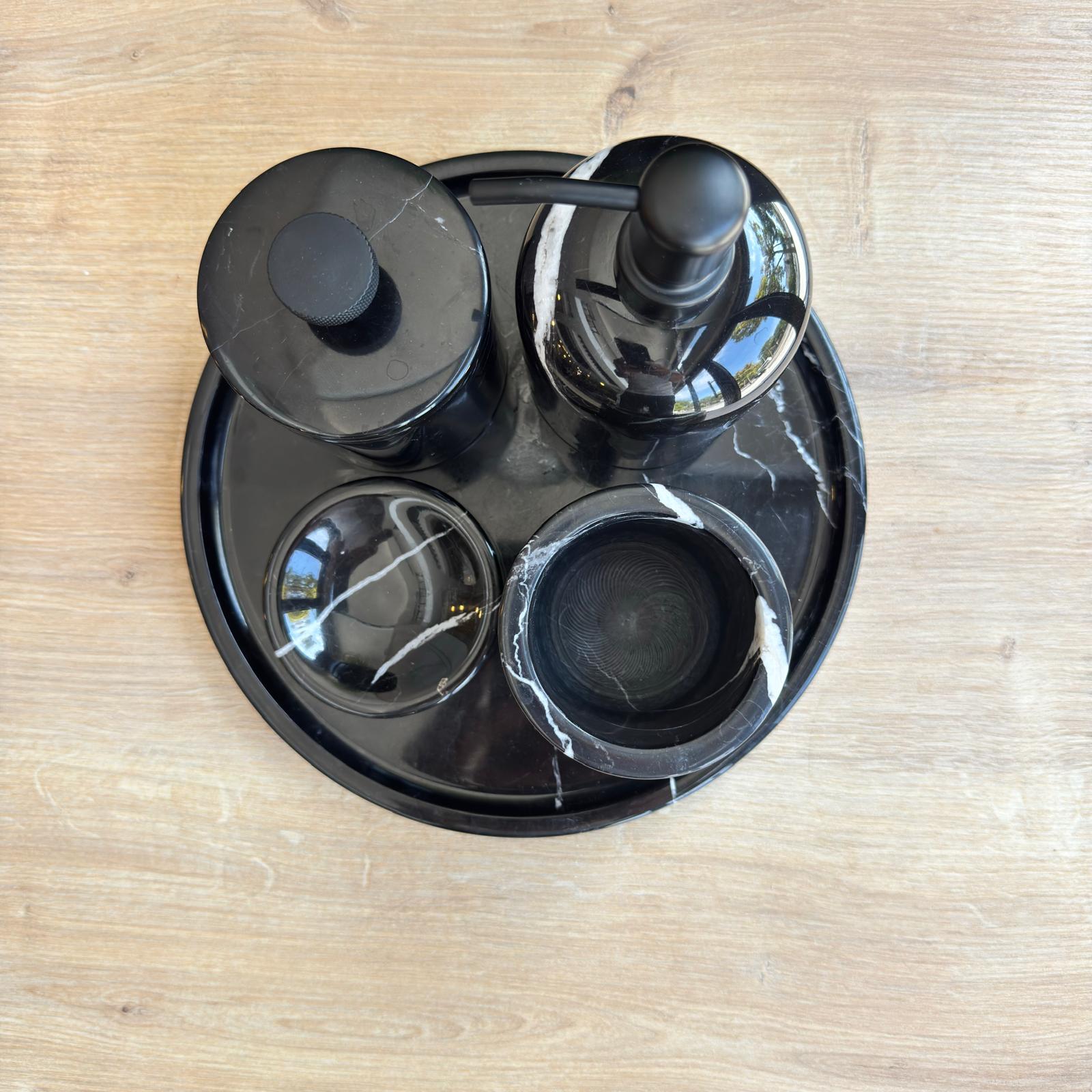 - Banyo seti içerisinde yer alan sıvı sabunluk, pamukluk, diş fırçalık, katı sabunluk aksesuar sunum tepsisi yer almaktadır.5 parçalı mermer banyo seti, banyo dekorasyonunuza mermerin doğal dokusunu katacak .