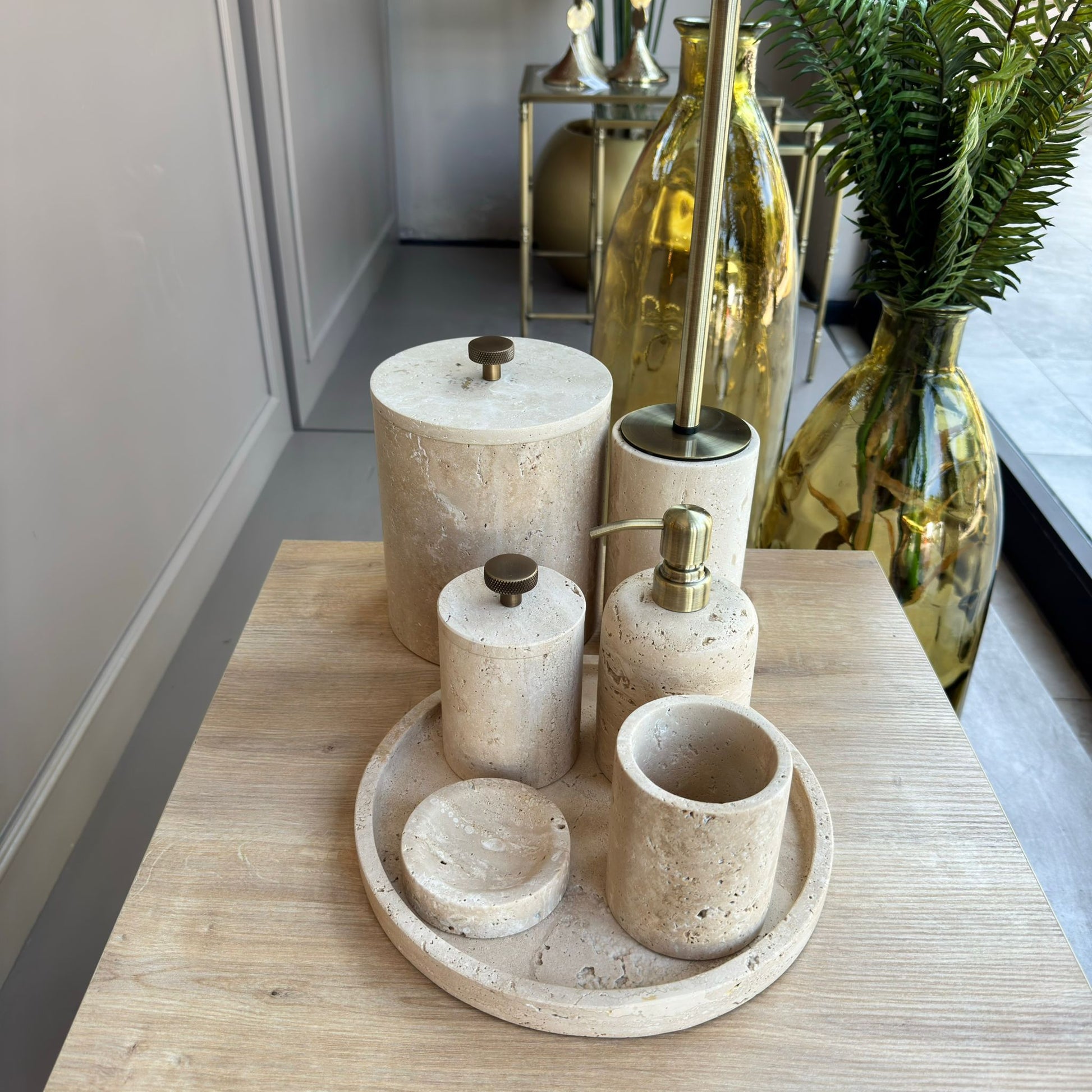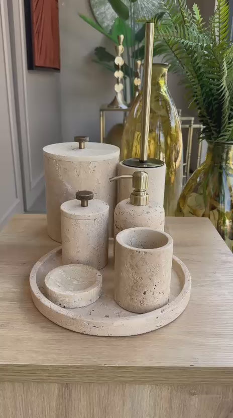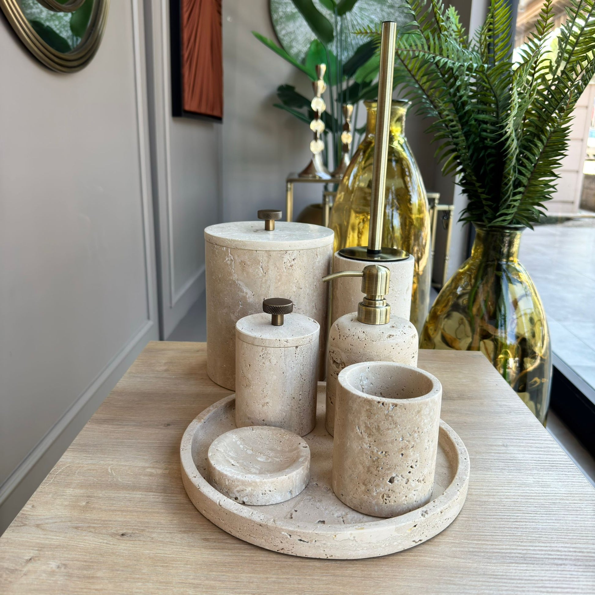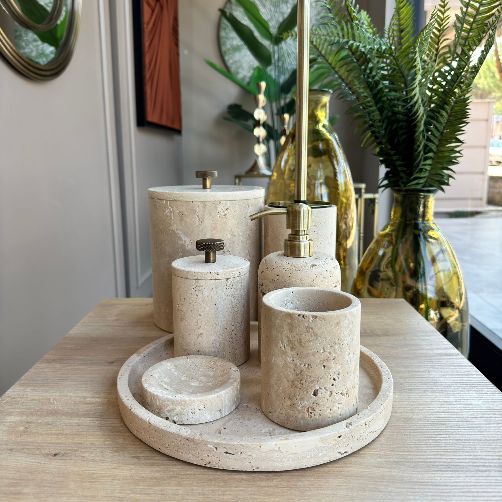 - Doğal traverten mermer malzemesiyle üretilmiş, banyonuza şıklık katan yedi parçadan oluşan set.