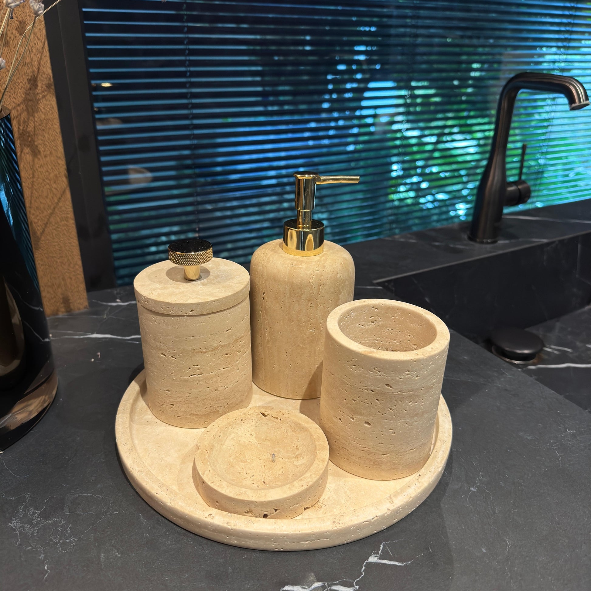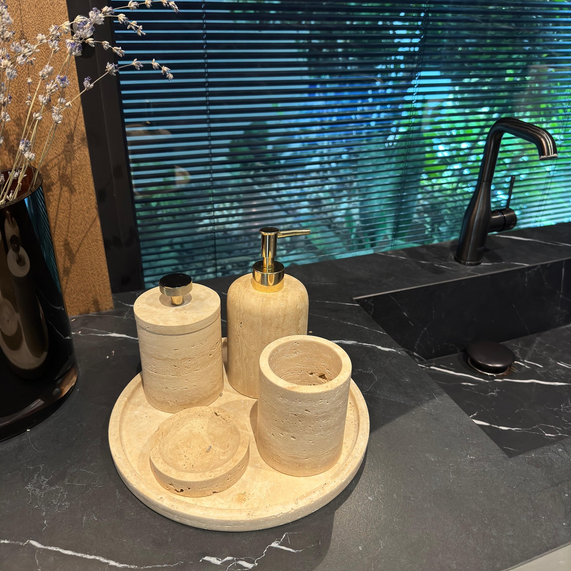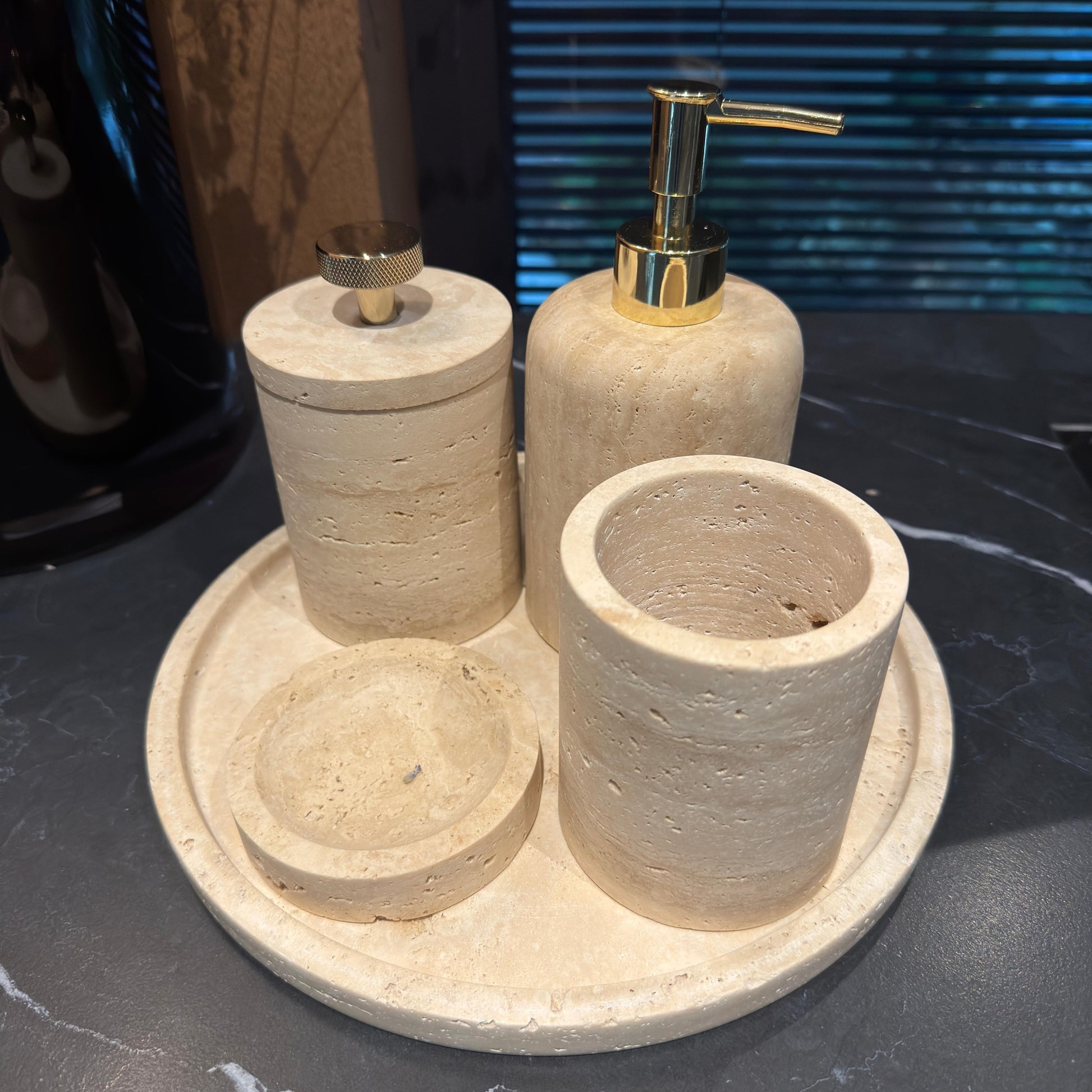 - Banyo set içeriği : Sıvı sabunluk: Çap 9cm , yükseklik 18 cm pamukluk : Çap 8,5 cm, yükseklik 10 cm diş fırçalık:Çap 8,5 cm , yükseklik 10 cm katı sabunluk:Çap 9 cm , yükseklik 2 cm , aksesuar tepsisi :Çap 27cm , yükseklik : 2cm ,Malzeme : %100 traverten mermer.