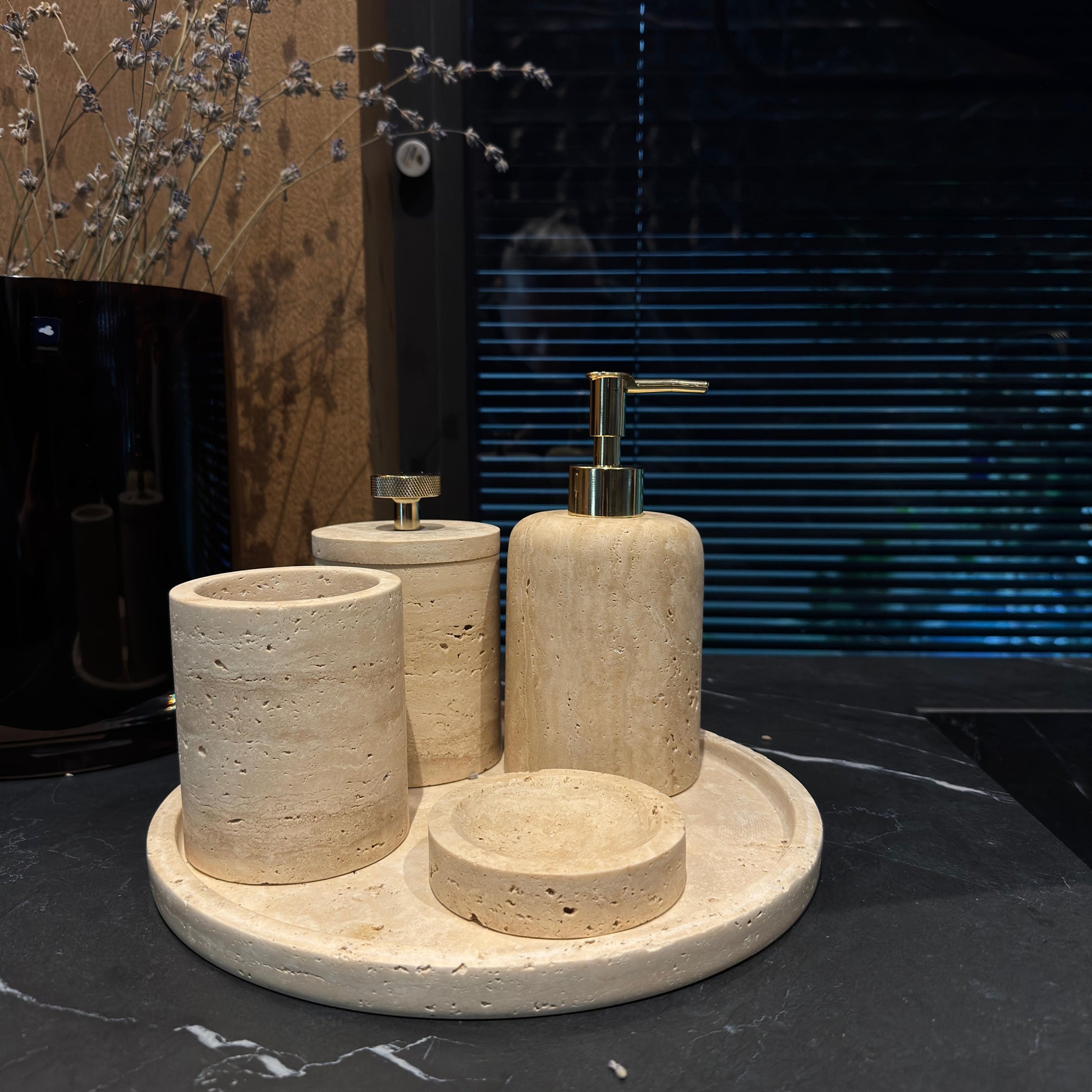 - Doğal traverten mermer malzemesiyle üretilmiş, banyonuza şıklık katan beş parçadan oluşan set.