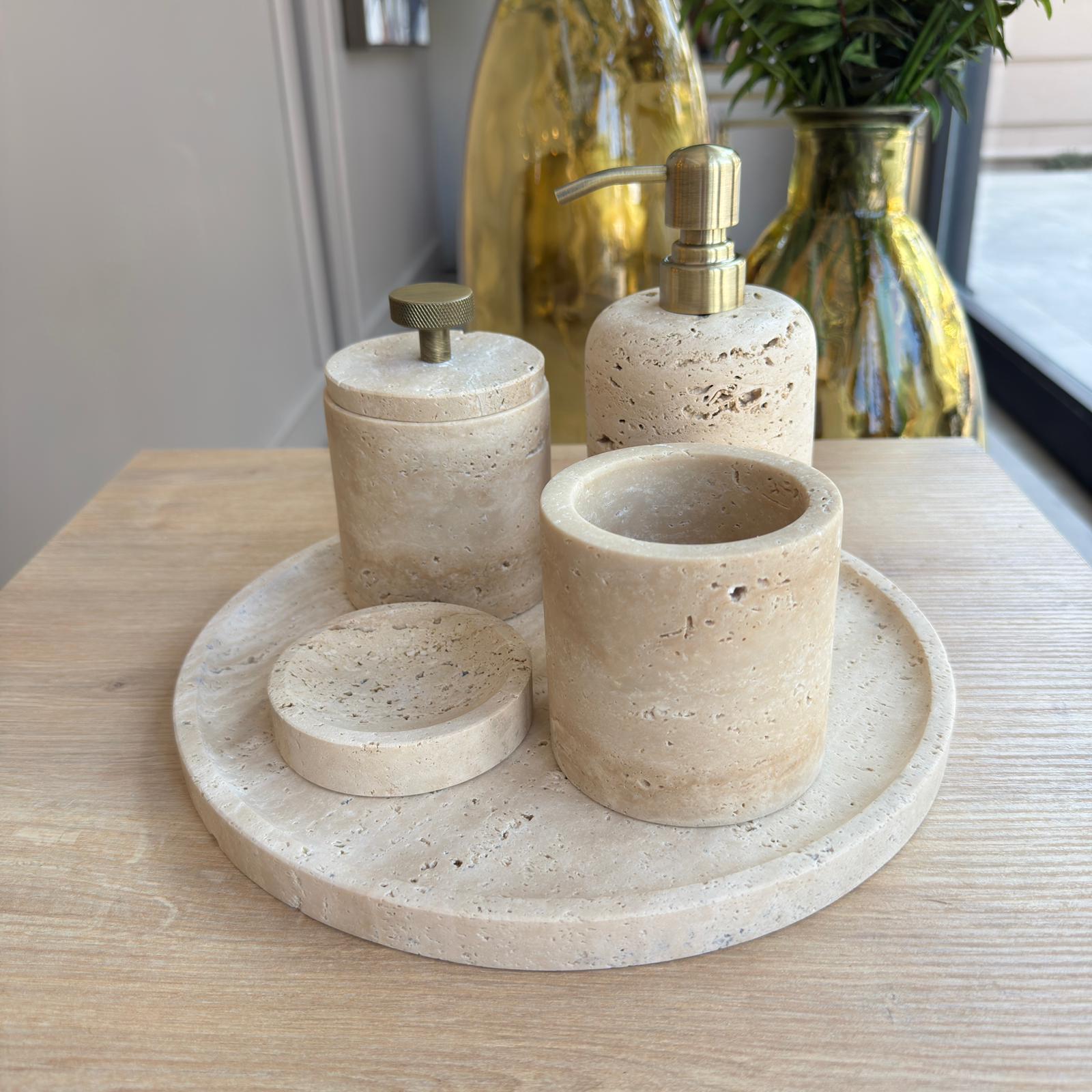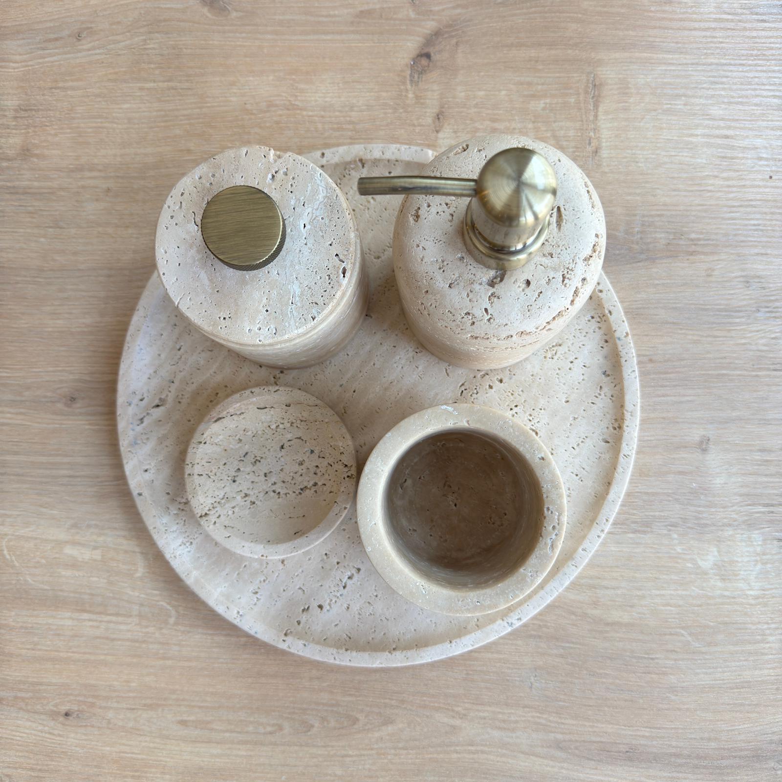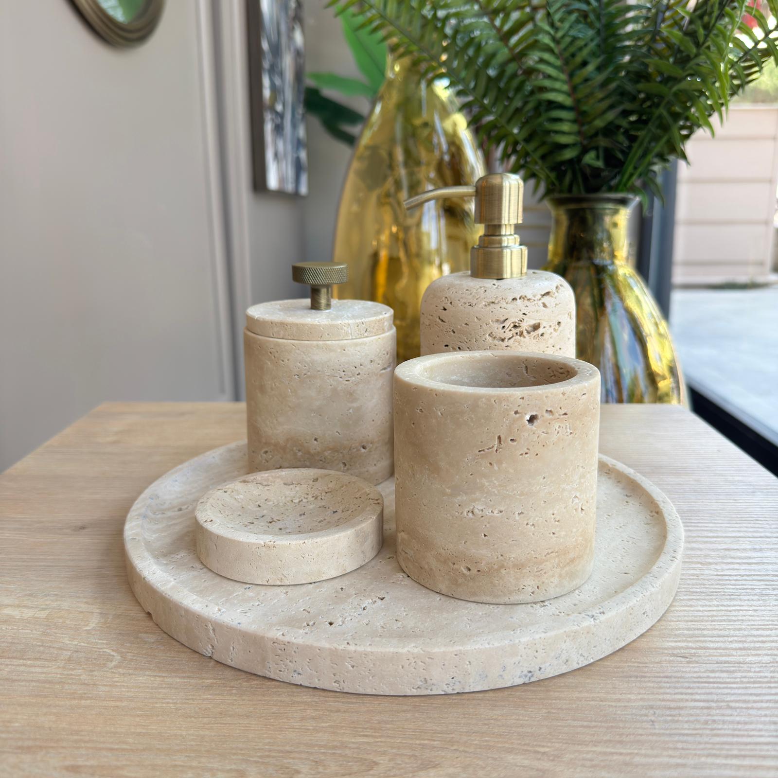Doğal traverten mermer malzemesiyle üretilmiş, banyonuza şıklık katan beş parçadan oluşan set.