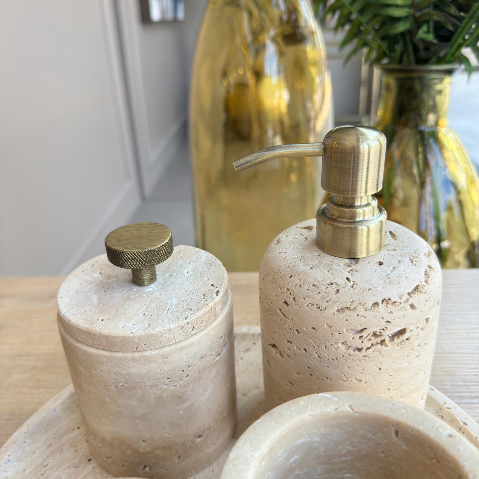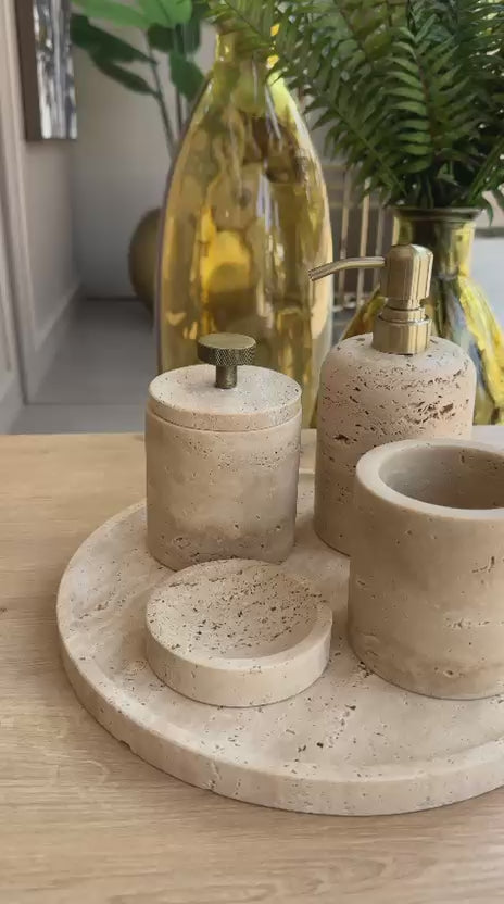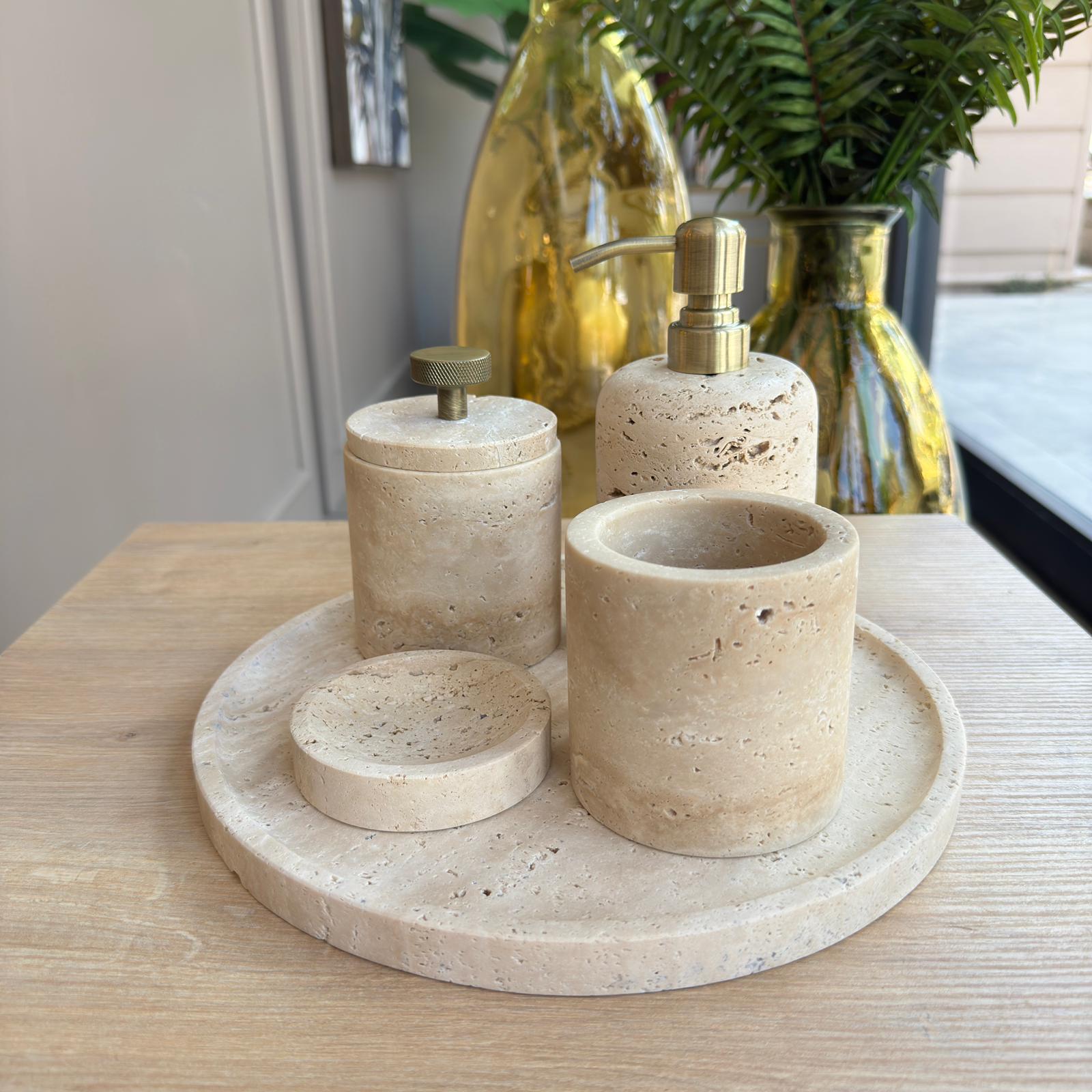 Doğal traverten mermer malzemesiyle üretilmiş, banyonuza şıklık katan beş parçadan oluşan set.